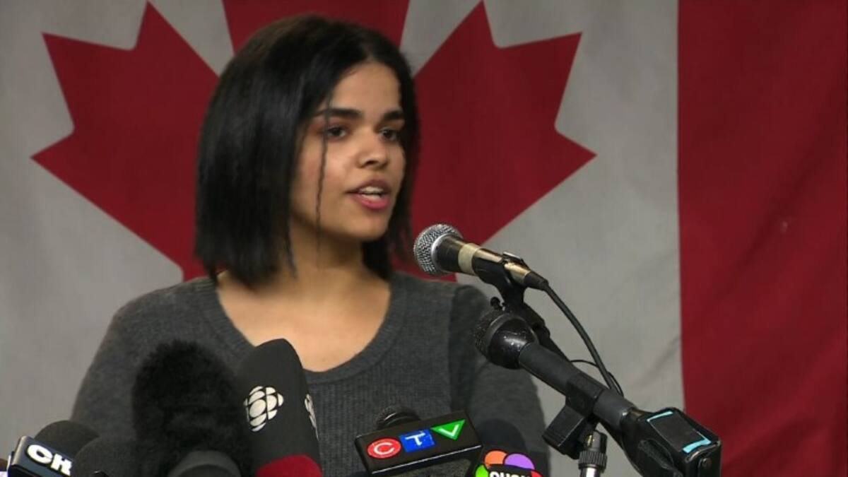 Rahaf Mohamed, que quiere suprimir el apellido familiar Al Qunun porque dice que su familia renegó de ella, se expresó en árabe con soltura y con una sonrisa, y sus declaraciones fueron traducidas al inglés por una intérprete.