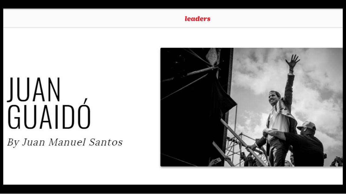 Haciendo una comparación de naciones y del realismo mágico de Gabriel García Márquez, el expresidente Juan Manuel Santos fue escogido por la Revista Time para escribir su opinión sobre el líder opositor venezolano Juan Guaidó.