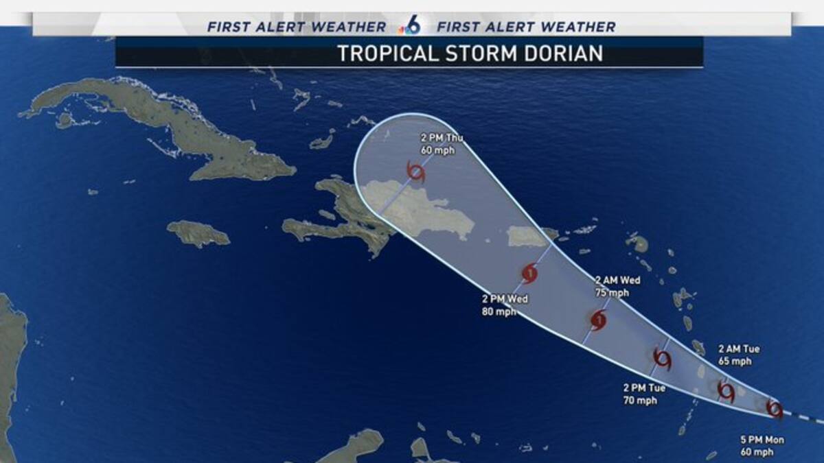 Con vientos máximos sostenidos de 95 km/h, Dorian 'seguirá intensificándose y podría estar cerca de tener fuerza de huracán cuando pase por el norte de las Islas de Barlovento el martes, y se espera que sea un huracán cuando se desplace cerca de Puerto Rico y el este de La Española', escribió el Centro Nacional de Huracanes (NHC).