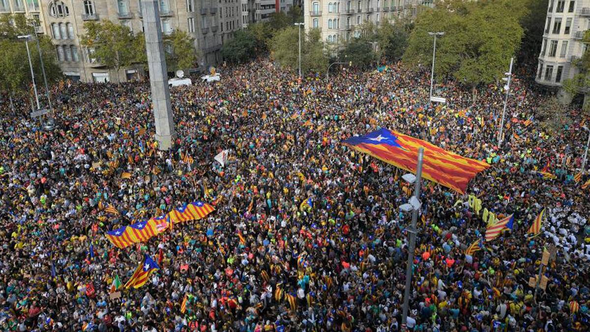 Escenario la víspera de fuertes enfrentamientos con la policía, todavía visibles en el asfalto quemado y los cristales rotos, el paseo de Gracia y sus alrededores quedaron inundados por una marea amarilla, roja y azul, los colores de la bandera independentista. Según la policía municipal, hubo unas 525.000 personas.