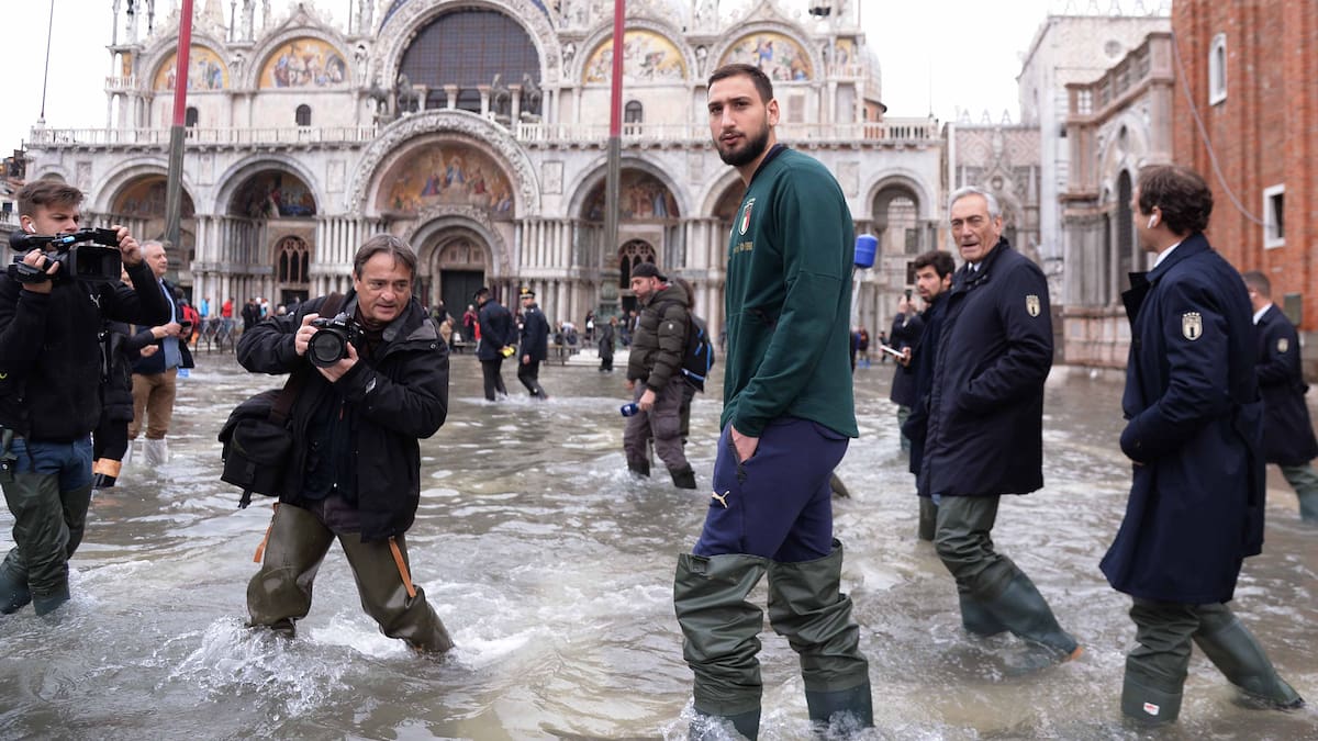 El portero Gianluigi Donnarumma y el presidente de la federación Gabriele Gravina se pusieron botas de agua y pisaron la emblemática plaza de San Marco, todavía cubierta de agua, que fue reabierta al público este sábado.
