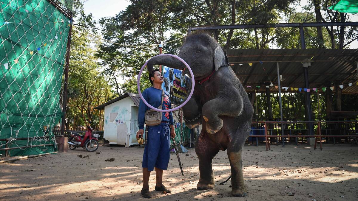 'No los criamos para lastimarlos (...) Si no son tercos, no les hacemos nada', asegura a la AFP el cornaca Charin, mientras pide a un joven elefante que se sostenga sobre las patas traseras con un globo en la trompa.