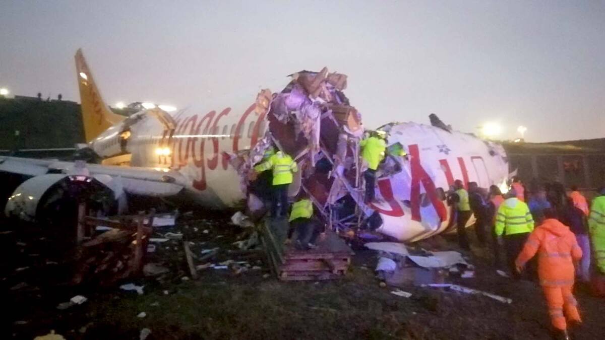 El avión de la compañía Pegasus Airlines procedía de la ciudad costera de Esmirna cuando en un 'violento aterrizaje' en el aeropuerto de Sabiha Gokcen se salió de la pista en medio de fuertes vientos e intensas lluvias, informó la cadena NTV.