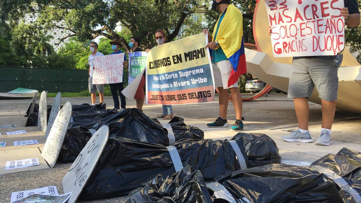 Frente a bolsas negras de basura que semejaban cadáveres, los activistas mostraron pancartas en las que se denunciaban el asesinato de 282 líderes sociales y las 33 masacres durante el actual Gobierno de Iván Duque, del partido Centro Democrático, fundado por Uribe (2002-2010).