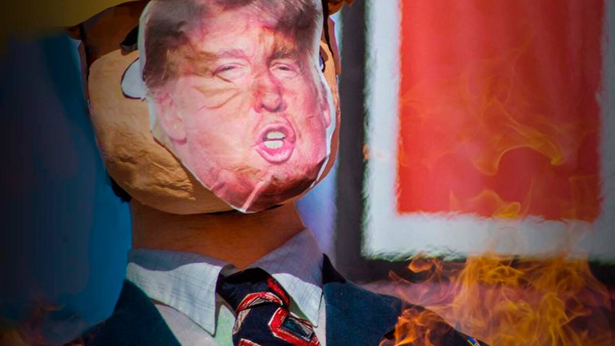 Unos 50 migrantes mexicanos y centroamericanos se reunieron a unos metros del muro fronterizo que divide a Estados Unidos y México, en la zona de Playas de Tijuana, en donde protestaron contra la violencia policial con la quema de dos piñatas con la figuras del presidente estadounidense, Donald Trump, y de un agente de la policía.