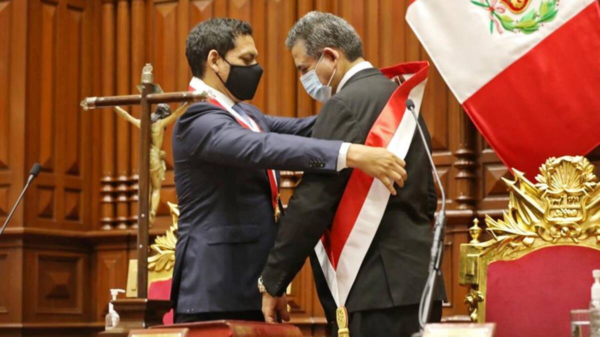 En una ceremonia realizada en el hemiciclo parlamentario, el primer vicepresidente del Congreso Luis Valdez le tomó juramento a Merino, que era hasta ayer el titular del Legislativo, y le colocó la banda que lo identifica como jefe de Estado.