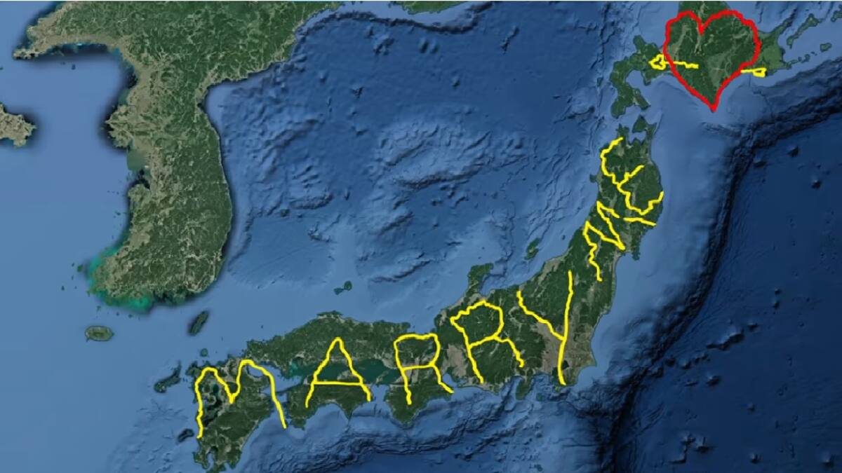 La inusual idea surgió del artista Yasushi Takahashi, residente en Tokio, quien sorprendió a su novia, Natsuki, con una particular propuesta de matrimonio, utilizando Google Earth como un lienzo en el que pueden pintar con los pies.