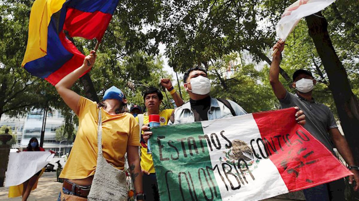 Unos 300 colombianos se manifestaron este sábado en Ciudad de México para mostrar su rechazo a la represión y la violencia de la fuerza pública en su país contra las protestas ciudadanas que reclaman parar las reformas anunciadas por el presidente Iván Duque.