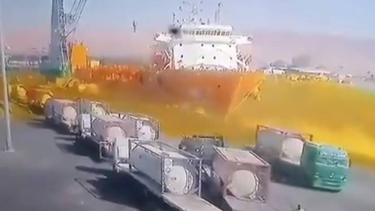Tras el impacto, una enorme nube de un intenso color amarillo se propagó por toda la zona, mientras que el personal portuario salió corriendo del lugar antes de ser engullidos por el gas.