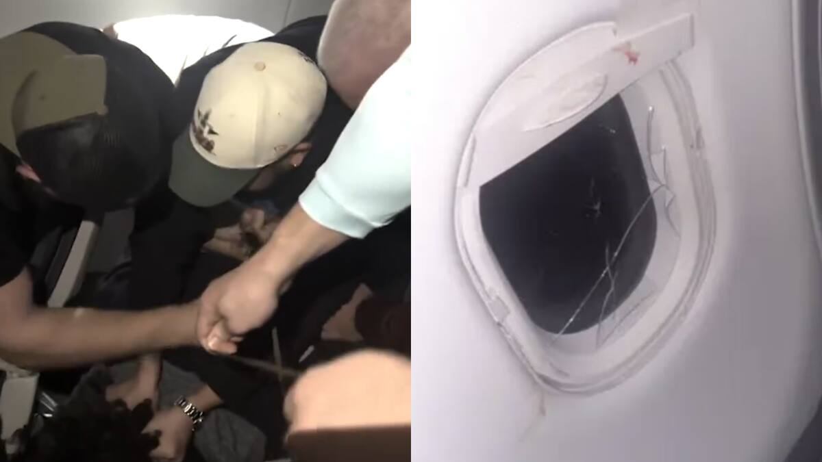 De un momento a otro, el pasajero violento comenzó a patear con mucha fuerza una de las ventanas del avión, logrando agrietar el vidrio.