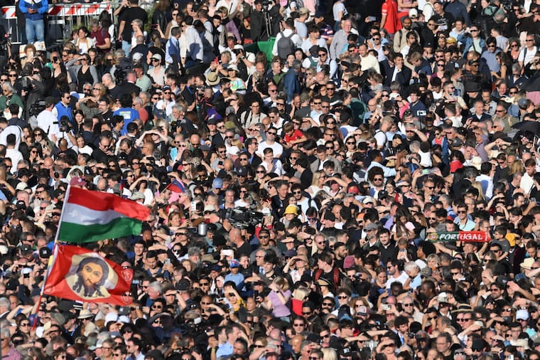 Los congregados han prorrumpido en un grito generalizado y grandes aplausos, mientras los fieles y curiosos agitan banderas nacionales.