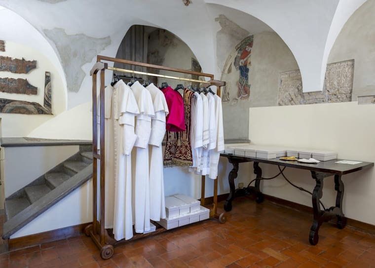 En esa cámara hay tres hábitos largos o sotanas de color blanco de distinto tamaño en función de la altura del elegido, así como cuatro vestimentas cortas tipo sobrepelliz, una muceta o esclavina de color morado y una estola púrpura con decoración dorada.