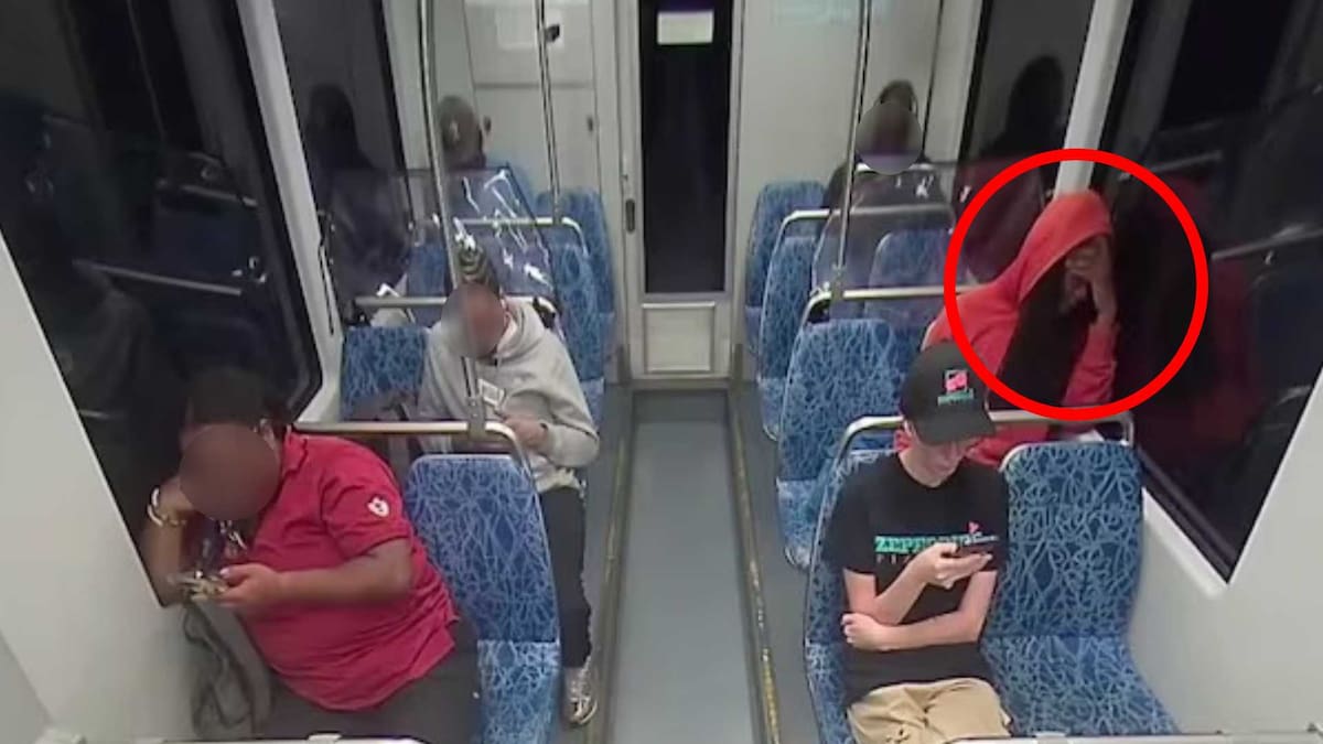 En la grabación se ve el momento en el que la joven está sentada en una de las sillas del tren, cerca de la puerta. Atrás suyo está el agresor, vestido con un saco rojo y con la capota de este puesta.