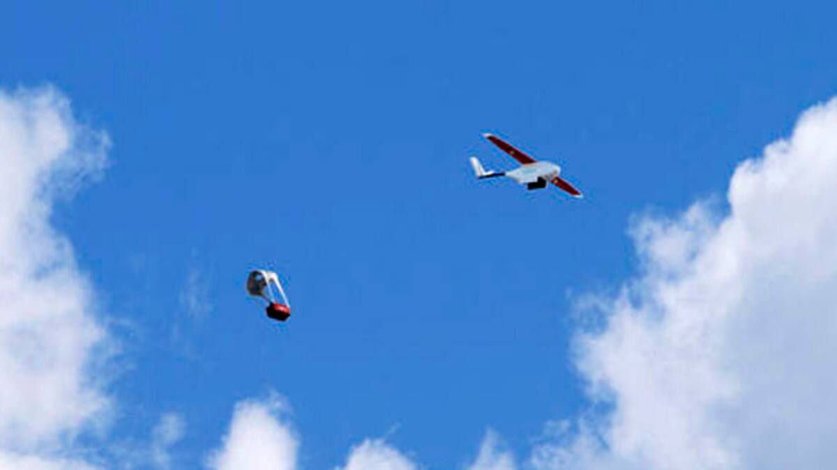 Cuando el dron llegó a su destino, el fondo de la aeronave se abrió y salió una caja de cartón con un paracaídas fabricado con cinta y papel estraza. El paquete cayó a unos pasos del director general Keller Rinaudo, quien caminó hacia él para recuperarla.