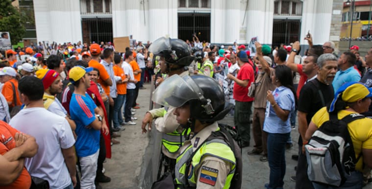Un cordón policial separa al grupo de seguidores del opositor venezolano Leopoldo López.