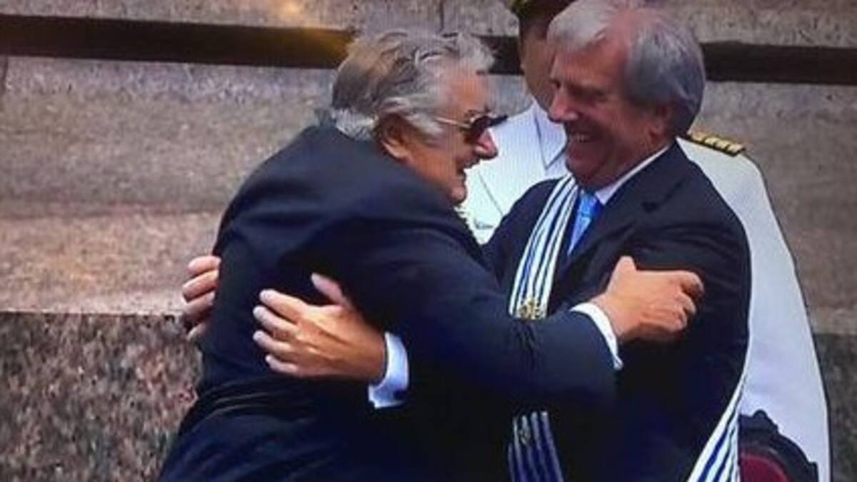 El nuevo mandatario de Uruguay, Tabaré Vázquez, recibió hoy de manos de su antecesor, José Mujica, la banda presidencial, un gesto que recordó al que se produjo hace cinco años en la misma ceremonia, cuando la entrega fue a la inversa.
