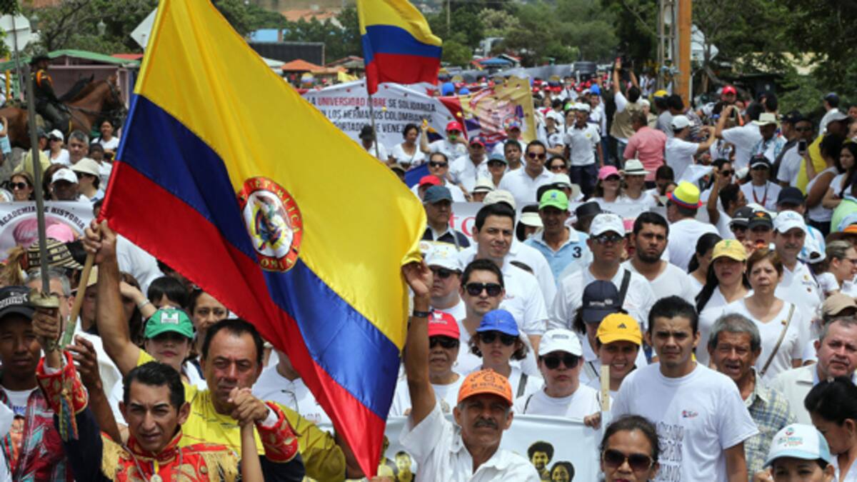 Con camisetas blancas y amarillas de la selección colombiana de fútbol, unas 500 personas caminaron desde el Templo Histórico de Villa del Rosario hasta la entrada del puente internacional Simón Bolívar, que une a Colombia y Venezuela y es el paso más activo de los 2.219 kilómetros de frontera común.