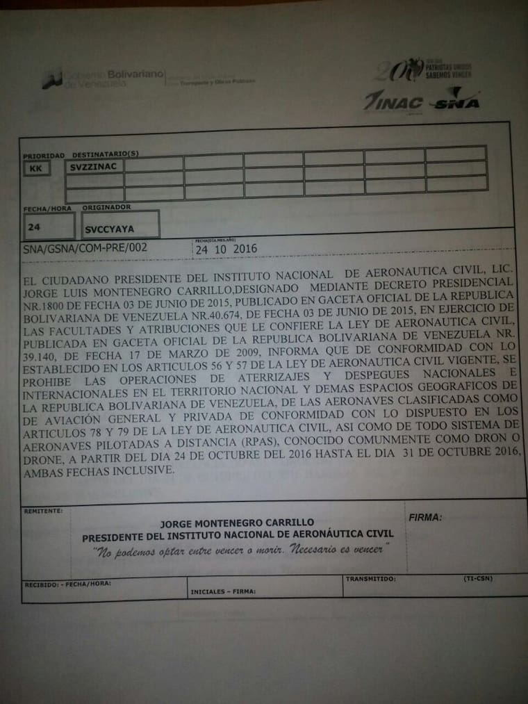 En el documento, firmado por Montenegro Carrillo, se lee 'se prohibe las operaciones de aterrizajes y despegues nacionales e internacionales en el territorio nacional y demás espacios geográficos de la República Bolivariana de Venezuela'.