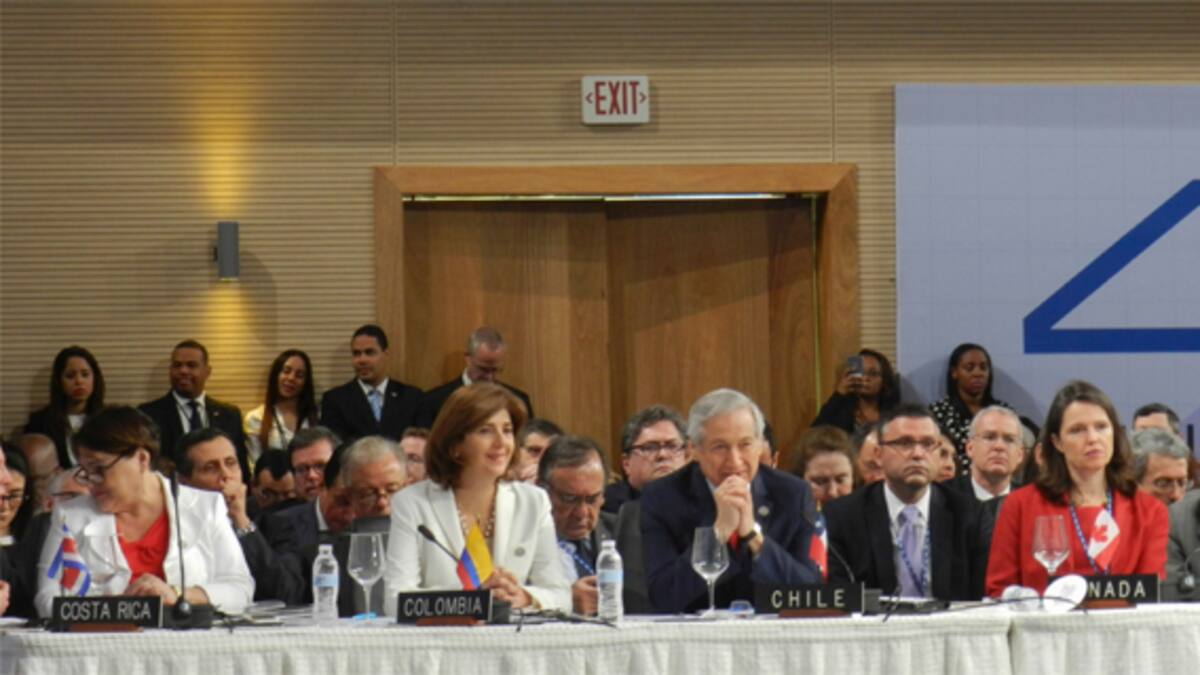 La canciller, María Ángela Holguín, se encuentra en República Dominicana como representante de Colombia en compañía del viceministro de Asuntos Multilaterales, Francisco Echeverri; el embajador de Colombia ante la OEA, Andrés González, y el director de Asuntos Políticos Multilaterales, Mauricio González.