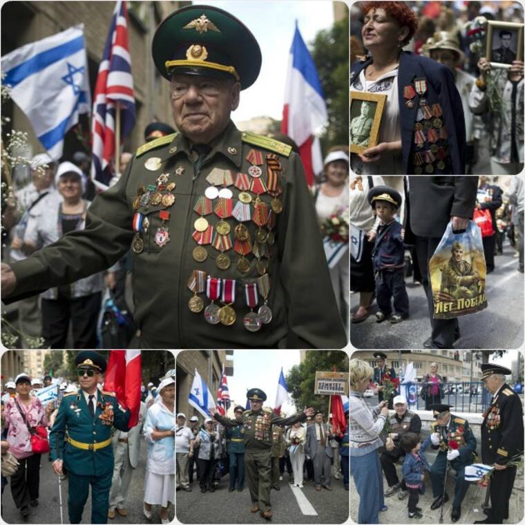 '¡Enhorabuena!', '¡Gracias!', '¡Spasiva!' y '¡Tenéis todo nuestro respeto!', fueron algunos de los gritos con que los asistentes lanzaban a los antiguos combatientes, en su mayoría originarios de la antigua URSS, de donde proceden un millón y medio de israelíes.