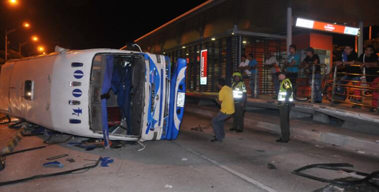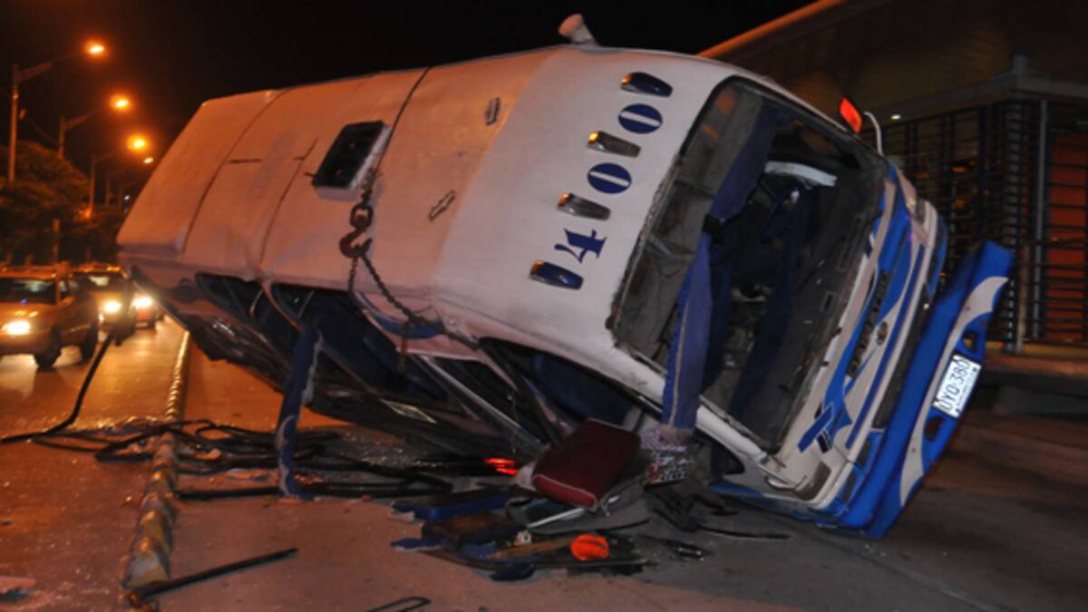 Los hechos se registraron hacia las 10:30 p.m. cuando, al parecer, un taxi frenó adelante de la buseta -de placas UYQ 380- y, para esquivarlo, el conductor maniobró chocando contra los separadores del carril 'solo bus' del sistema de transporte Transmetro. Al perder el control del vehículo, la buseta se estrelló contra un alimentador de Transmetro y se volteó.