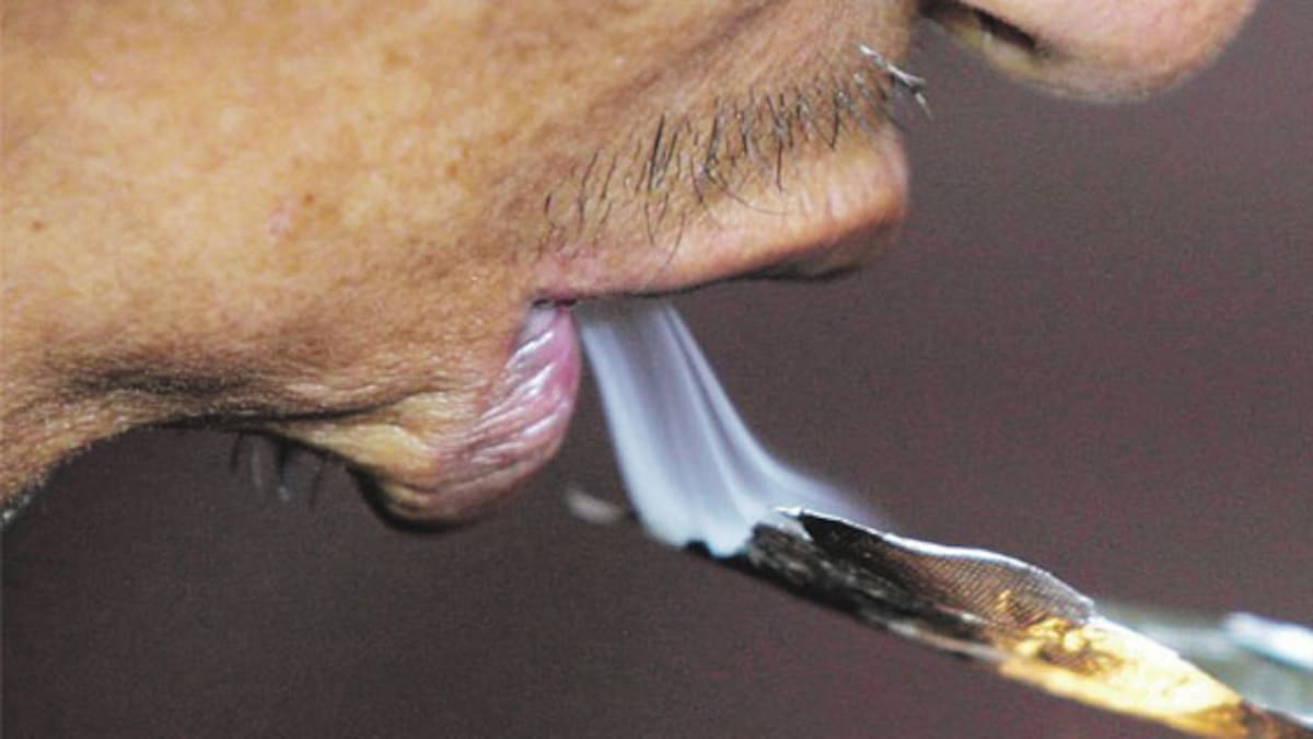 Pegarse un ‘dragonazo’ consiste en apilar la heroína sobre un papel aluminio, quemarla por debajo e inhalar el humo que sube, generalmente ayudándose con un pitillo u objeto cónico.