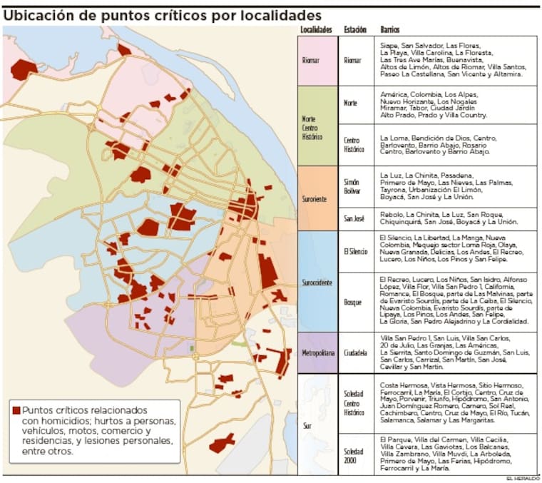 En el caso de Barranquilla, dividida en las cinco localidades Riomar, Norte-Centro Histórico, Suroriente, Suroccidente y Metropolitana, la georreferenciación ha permitido establecer que los delitos varían en cada una.