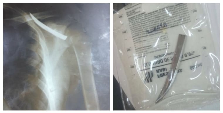 En el hospital Juan Domínguez Romero de Soledad un cirujano sacó una hoja de cuchillo, de 14 centímetros de largo, de la espalda de Johnny Junior Pacheco Molinares, de 19 años, quien había sido herido hace un mes, al parecer durante una riña.