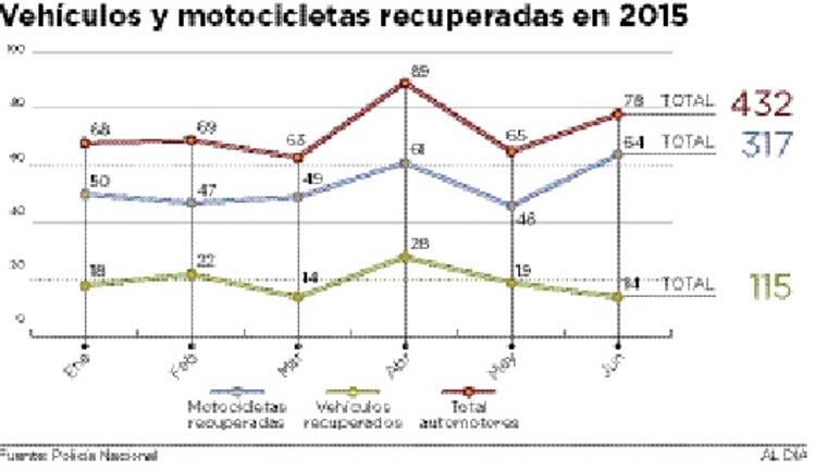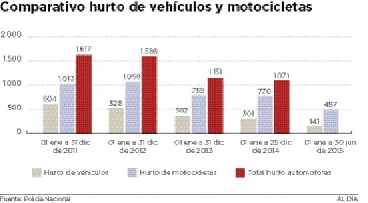 De acuerdo con los números entregados, en estos primeros 181 días del año (desde el primero de enero al 30 de junio de 2015) se han robado 141 vehículos particulares, 487 motos y 14 taxis. Es decir, tres vehículos cada cuatro días; cinco motos cada dos días y alrededor de 1 taxi cada 15 días. Esto según cifras de denuncias hechas.