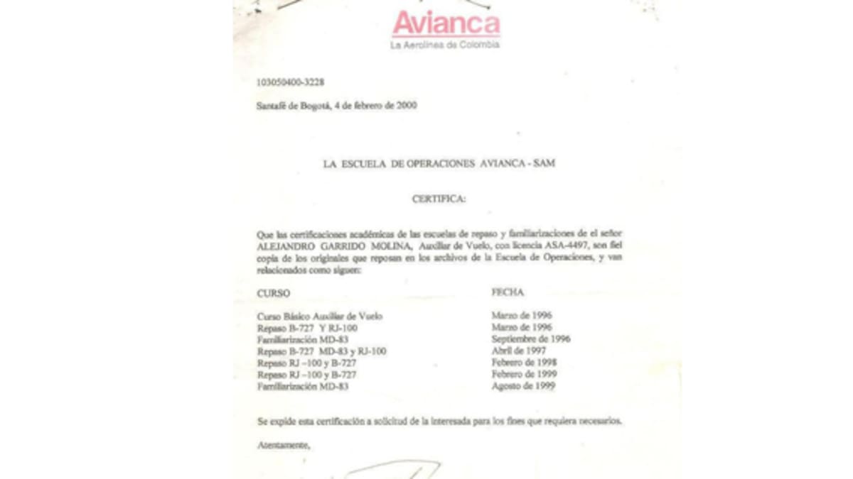 La empresa Avianca informó a este diario que Alejandro Garrido Molina estuvo vinculado como auxiliar de vuelo de la compañía SAM, entre el 3 de junio de 1996 y el 13 de noviembre de 1999, hasta que 'solicitó su retiro voluntario'.