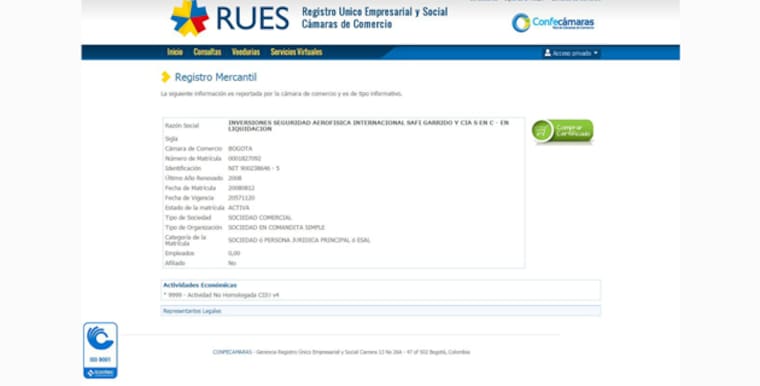 Al consultar el Registro Único Empresarial y Social (Rues) fue posible hallar un registro de la sociedad Inversiones Seguridad Aerofísica Internacional Safi Garrido y Compañía – en liquidación, que renovó por última vez en 2008 su matrícula mercantil y no tiene empleados. De la misma, por escritura pública en una notaría de Bogotá, Alejandro Garrido Molina fue nombrado el 20 de noviembre de 2007 su socio gestor y representante legal.