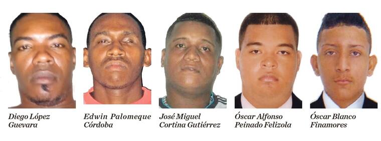 Fueron identificados como Diego López Guevara, de 31 años, alias Papalopito, señalado como uno de los jefes; Edwin Palomeque Córdoba (37), alias El Mocho; Óscar Peinado Felizola (21), alias Gordo Visaje; José Miguel Cortina Gutiérrez (32), alias Totocel; Óscar Blanco Finamores (23), alias El Búho.