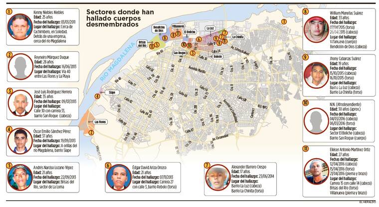 Así aconteció con el último de los casos, registrados este año en abril. La víctima fue Eliécer Antonio Martínez Ortiz, un bicitaxista de 27 años: el 12 de abril, en la carrera 15 con calle 14 –La Chinita– fue encontrada su cabeza después de que dos hombres en moto la dejaran tirada en plena vía, dentro de un paquete. Tres días después fue avistado el torso en el sector Brisas del Río y, el 21 de abril, un brazo y una pierna en Villanueva.