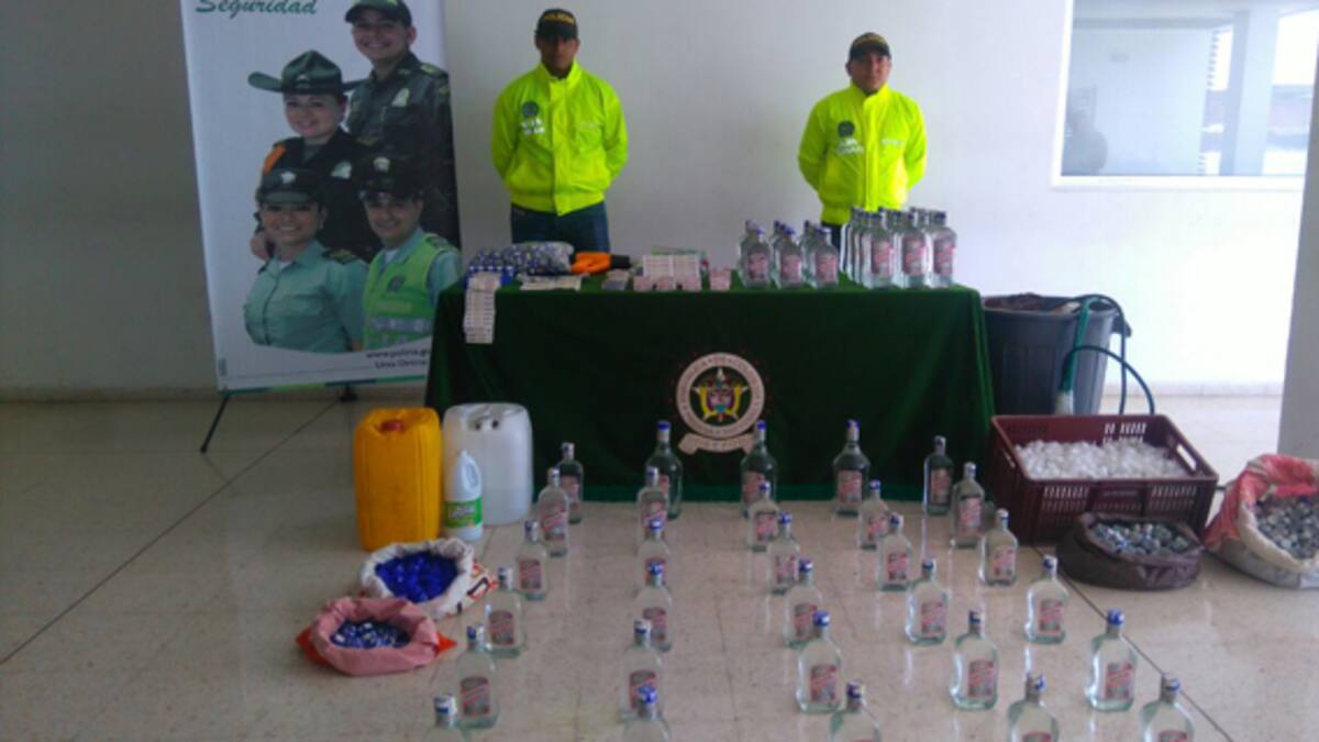 En las dos viviendas fueron incautado media pimpina de alcohol, 50 pecheras o etiquetas frontales para botellas de aguardiente; 100 tapas de color negro completas con cuello y gotero para botellas de ron, 100 tapas completas con cuello y gotero de aguardiente, 1.000 estampillas, 300 capuchones con logotipo de una fábrica de licores; 45 botellas de aguardiente de 1.000 c.c.; 20 botellas de aguardiente de 750 c.c.; 3 botellas de aguardiente de 2.500 c.c.; 169 estampillas representativas de aguardiente, 100 tapas representativas de aguardiente y una pimpina de aguardiente.