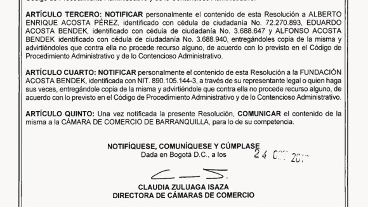 'Revocar los actos administrativos correspondientes a la inscripción de la reforma estatutaria, del nombramiento de Junta Directiva y la designación del presidente y vicepresidente de la Fundación, los cuales constan en el Acta de Asamblea Extraordinaria No. 001 del 5 de mayo de 2016', indica la resolución proferida el 24 de octubre de 2016.