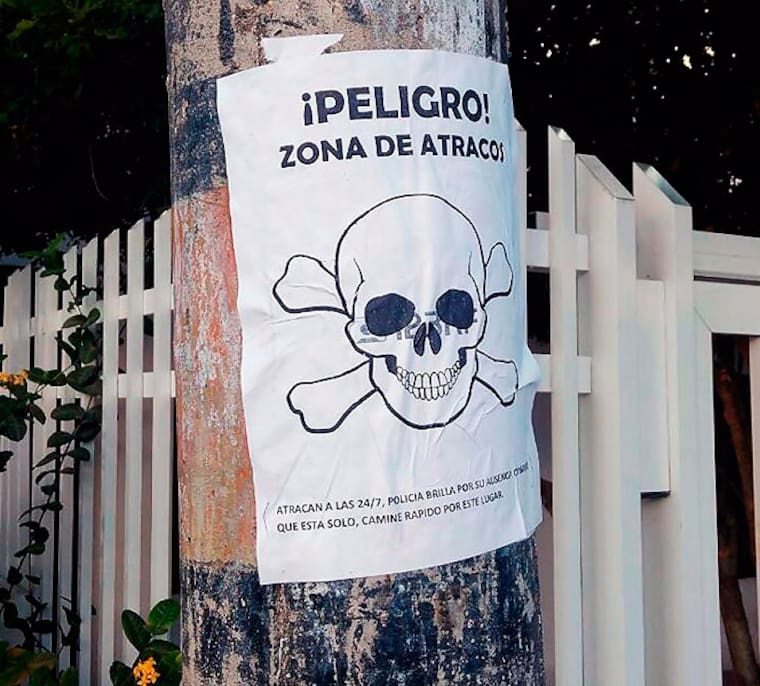 'Atracan a las 24/7, Policía brilla por su ausencia, considere que está solo, camine rápido por este lugar', se leía en una de las advertencias pegadas en los postes.