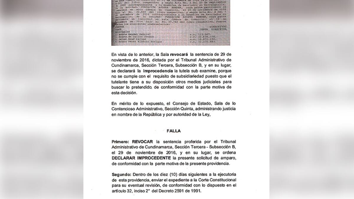 Ella se opuso al fallo del Tribunal que, en noviembre, resolvió tutelar los derechos al debido proceso, la defensa e igualdad que reclamó Luis Fernando Acosta Osío como representante de la fundación.