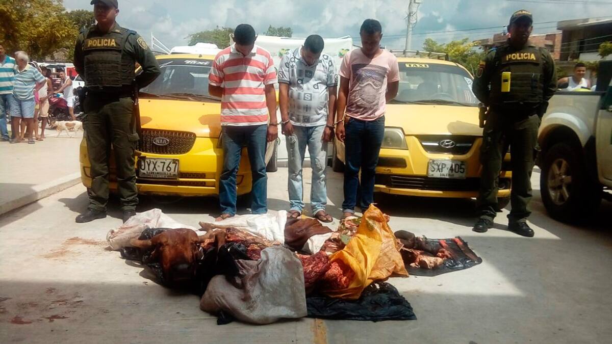 Agentes de la Sijín de la Policía del Atlántico capturaron a tres presuntos cuatreros cuando se movilizaban en dos taxis en los que transportaban consigo varios sacos que en su interior contenían carne producto del sacrificio ilegal de dos reses y un equino pertenecientes a una finca ubicada entre los municipios de Santo Tomás y Polonuevo.