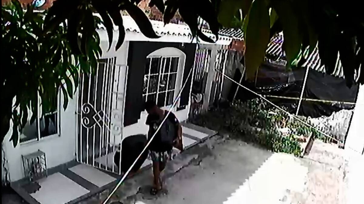 Luego de forcejear durante varios minutos con la reja de la puerta principal, el hombre sale del lugar con un televisor y lo que parece ser un equipo de sonido, valorado en siete millones de pesos, según contó el afectado.