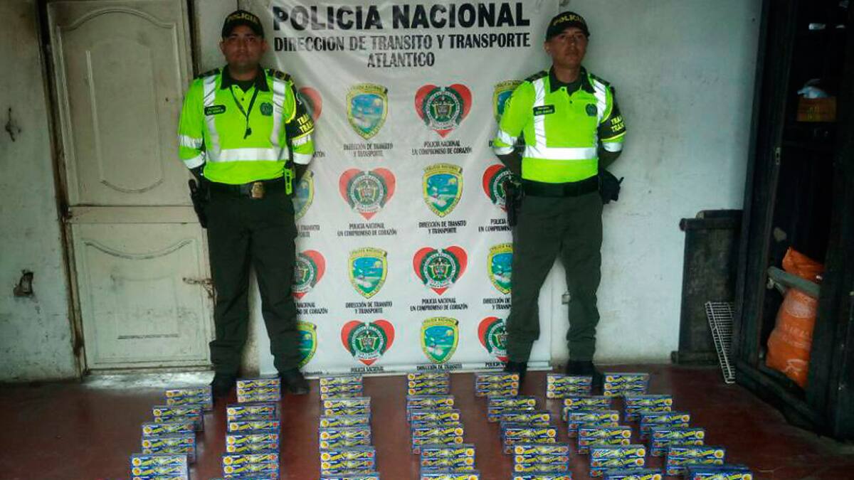 En la vía La Cordialidad, a la altura del peaje de Galapa, unidades de la Policía decomisaron 17.5 kilos de pólvora que iban camuflados en un bus de servicio público.