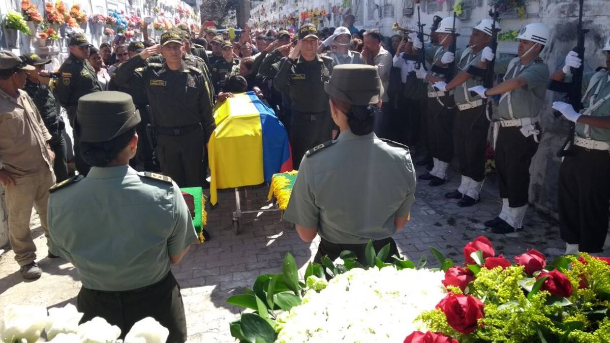 El general Mariano Botero Coy, comandante de la Policía, y el coronel Mauricio Pérez, subcomandante, estuvieron presentes en las honras fúnebres en la funeraria Capillas de La Fe y, posteriormente, ayudaron a cargar el féretro del uniformado en el cementerio Universal.