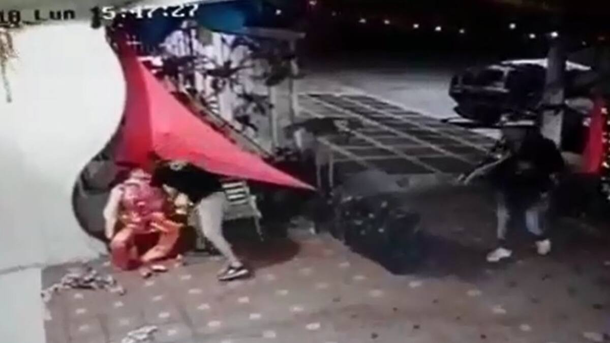 El tercer sujeto, quien conducía el vehículo, parquea frente al restaurante, mientras que los dos hombres se acercan y uno de ellos saca del interior del vehículo un objeto cortante.