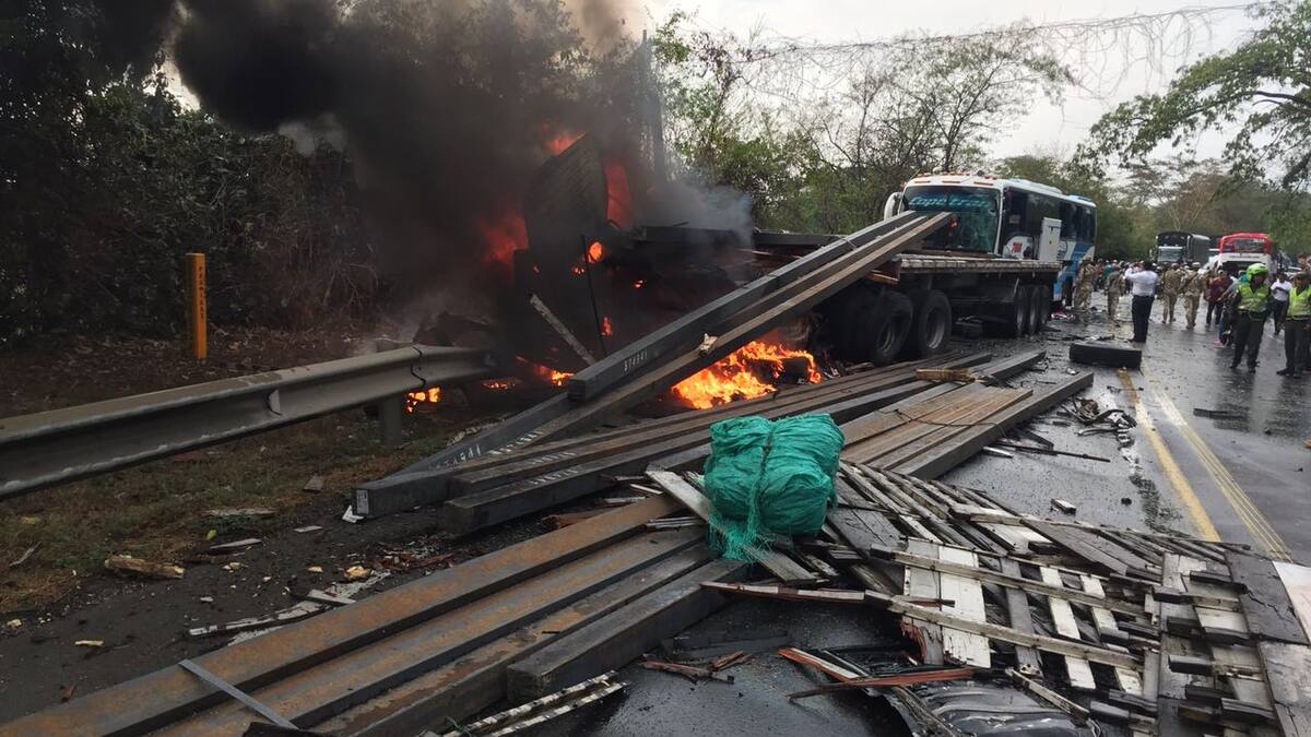 'Un bus de la empresa Brasilia coge abierta una curva y golpea con el tractocamión. El conductor frenó pero las varillas que traía destrozaron la cabina, originando la conflagración. Un bus de Copetran que viajaba detrás de la ‘mula’, intenta frenar pero lo golpea por detrás', manifestó el oficial.