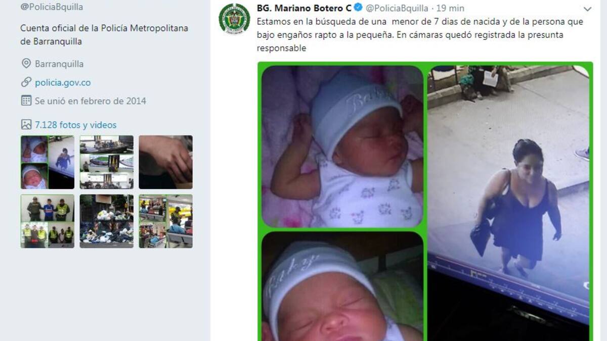 En la tarde de este miércoles, el general Mariano Botero Coy, comandante de la Policía Metropolitana de Barranquilla, divulgó a través de su cuenta de Twitter el caso del rapto de la pequeña de siete días de nacida, Grelianny Medina Jiménez, por una mujer que, aparentemente, se ganó la confianza de sus padres.