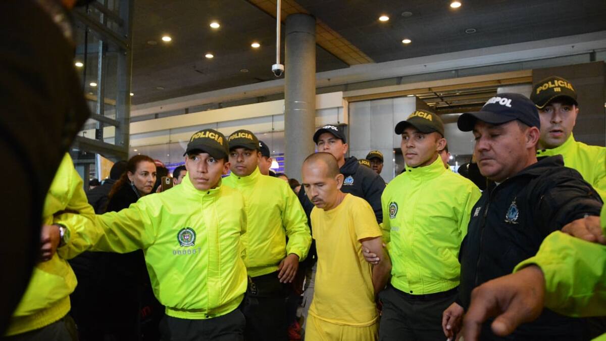 Una decena de agentes de la Dijín de la Policía y la Interpol escoltaron al sujeto, quién llegó con un atuendo penitenciario del vecino país, todo de color amarillo, y calzando unas sandalias de color negro con medias blancas.