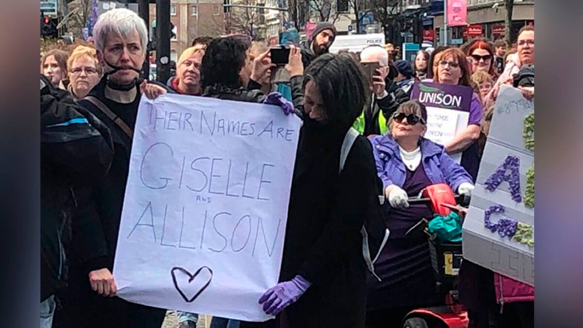 Dos de los manifestantes sostenían un cartel que decía: 'sus nombres son Giselle y Allison'.