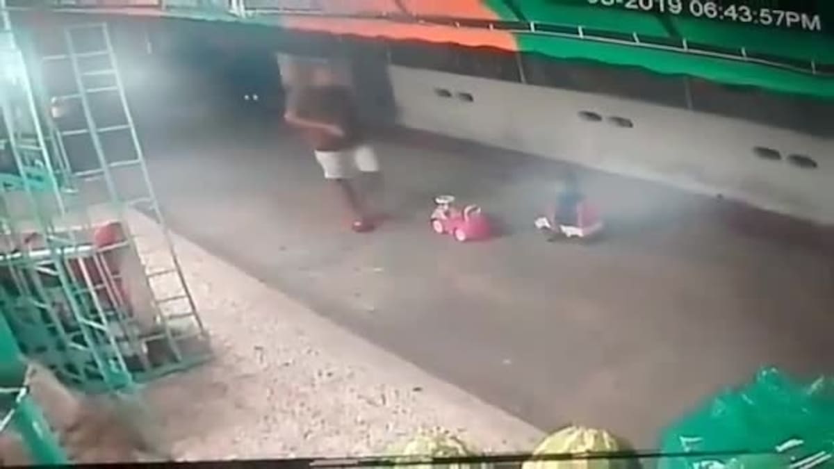 En las imágenes, se puede ver cuando un hombre vestido de camiseta,bermuda y con gorra, vigila a un menor mientras este juega en un triciclo.