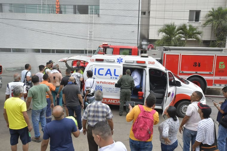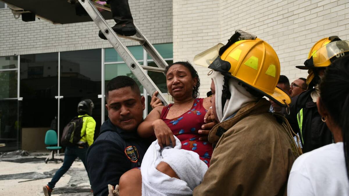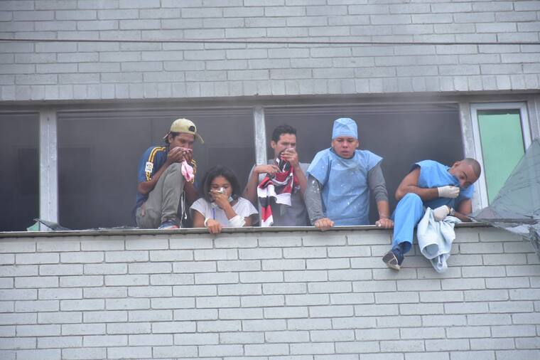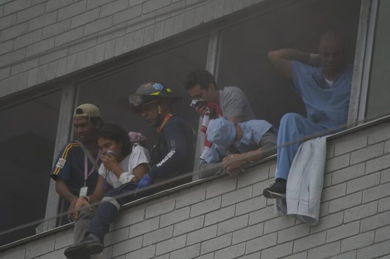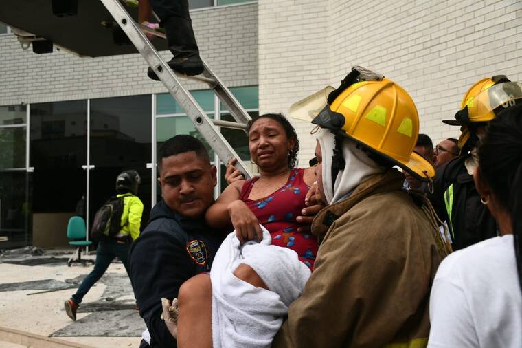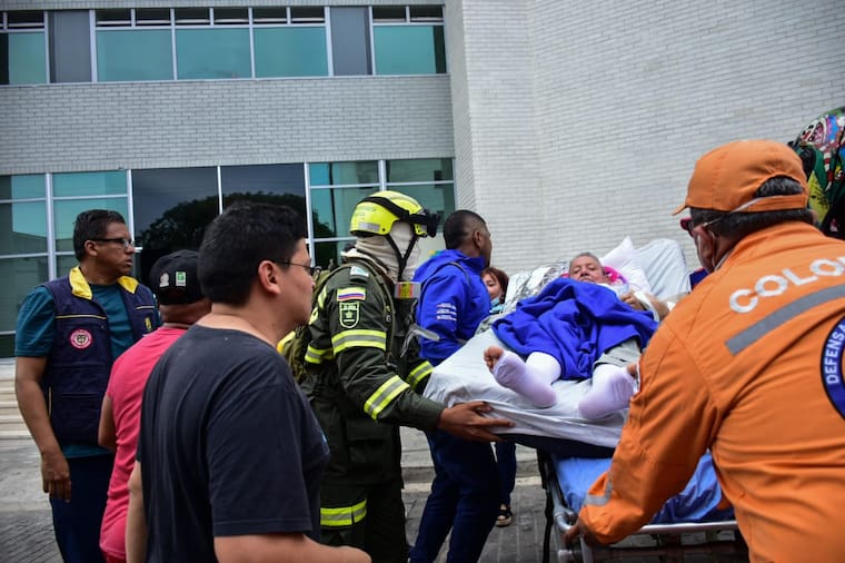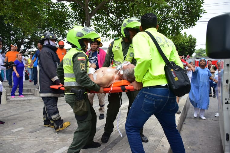 Miembros del cuerpo de Bomberos que hacen presencia en el lugar, sacan en camillas y con ayuda de las más de 10 máquinas al personal atrapado en el centro de salud. Fotos de César Bolívar, Mery Granados y Josefina Villareal.