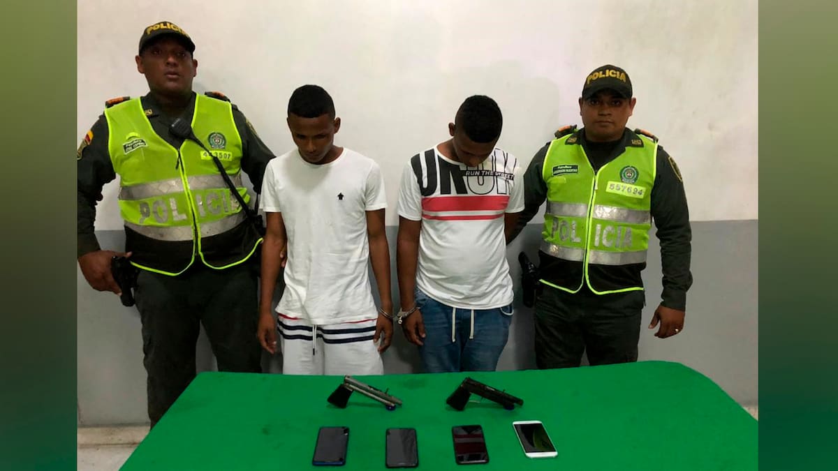 En una rápida reacción, los uniformados detuvieron en el barrio San Martín a Kevin Polo Sandoval, de 21 años, y Roberto Franco Morales, de 19, a quienes les hallaron en su poder los cuatro celulares que se habían hurtado en horas de la mañana, y les incautaron dos armas de fuego con las que intimidaron a sus víctimas.