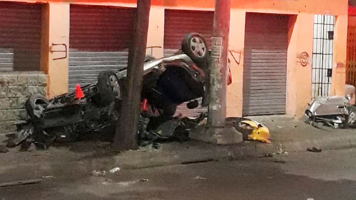 El automóvil, según testigos, se elevó 'como tres metros de altura, cayó unos 10 metros más adelante y quedó incrustado entre un poste de energía y la pared de un edificación de cuatro pisos.